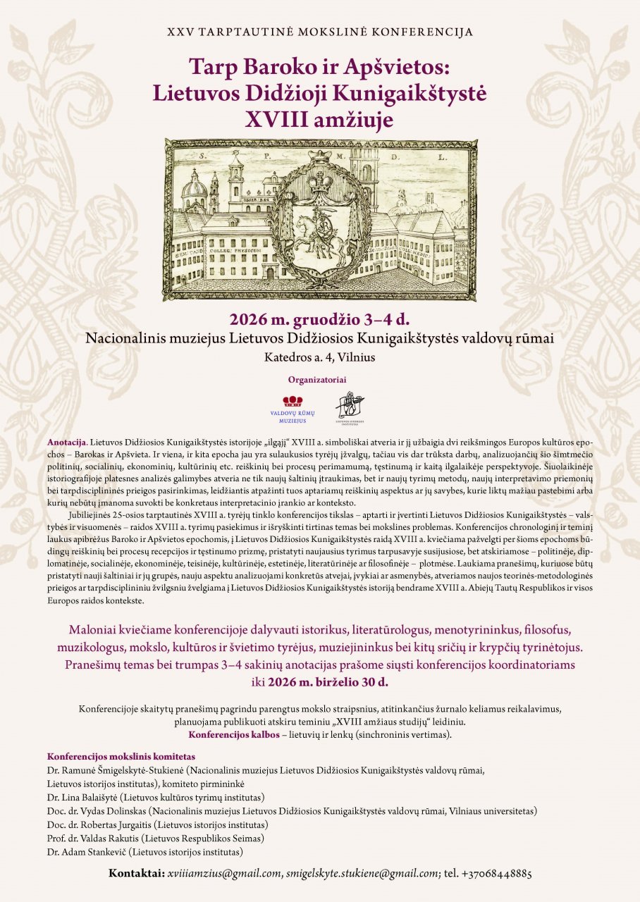 Lietuvos istorijos institutas ir Nacionalinis muziejus Lietuvos Didžiosios Kunigaikštystės valdovų rūmai maloniai kviečia teikti pranešimų paraiškas 25-ajai tarptautinei mokslinei konferencijai „Tarp Baroko ir Apšvietos: Lietuvos Didžioji Kunigaikštystė XVIII amžiuje“. Konferencija vyks 2026 m. gruodžio 3–4 d. Vilniuje.