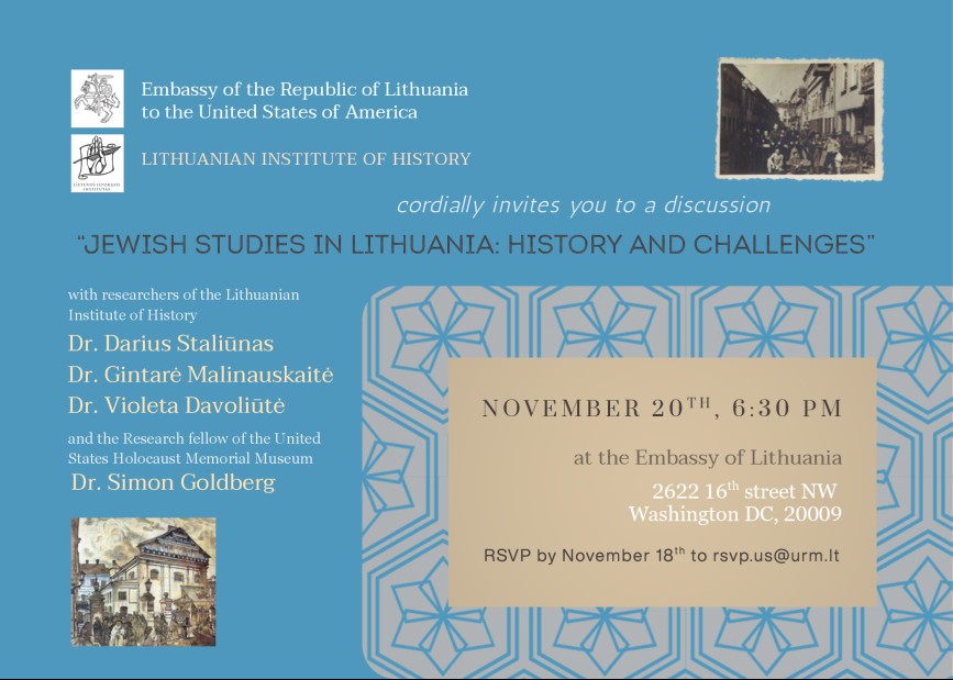 Lapkričio 20 d. 18.30 Lietuvos Respublikos ambasadoje Vašingtone organizuojama diskusija „Jewish Studies in Lithuania: History and Challenges“.